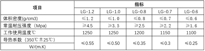 體積密度(g/cm3) ≤1.2 ≤1.0 ≤0.8 ≤0.7 ≤0.6 常溫耐壓強度(Mpa) ≥4.5 ≥3.5 ≥2.5 ≥2.2 ≥1.6 工作使用溫度℃ 1250 1250 1200 1150 1100 導熱系數(350℃±25℃) ≤0.55 ≤0.50 ≤0.35 ≤0.3 ≤0.25 W/(m.K)...